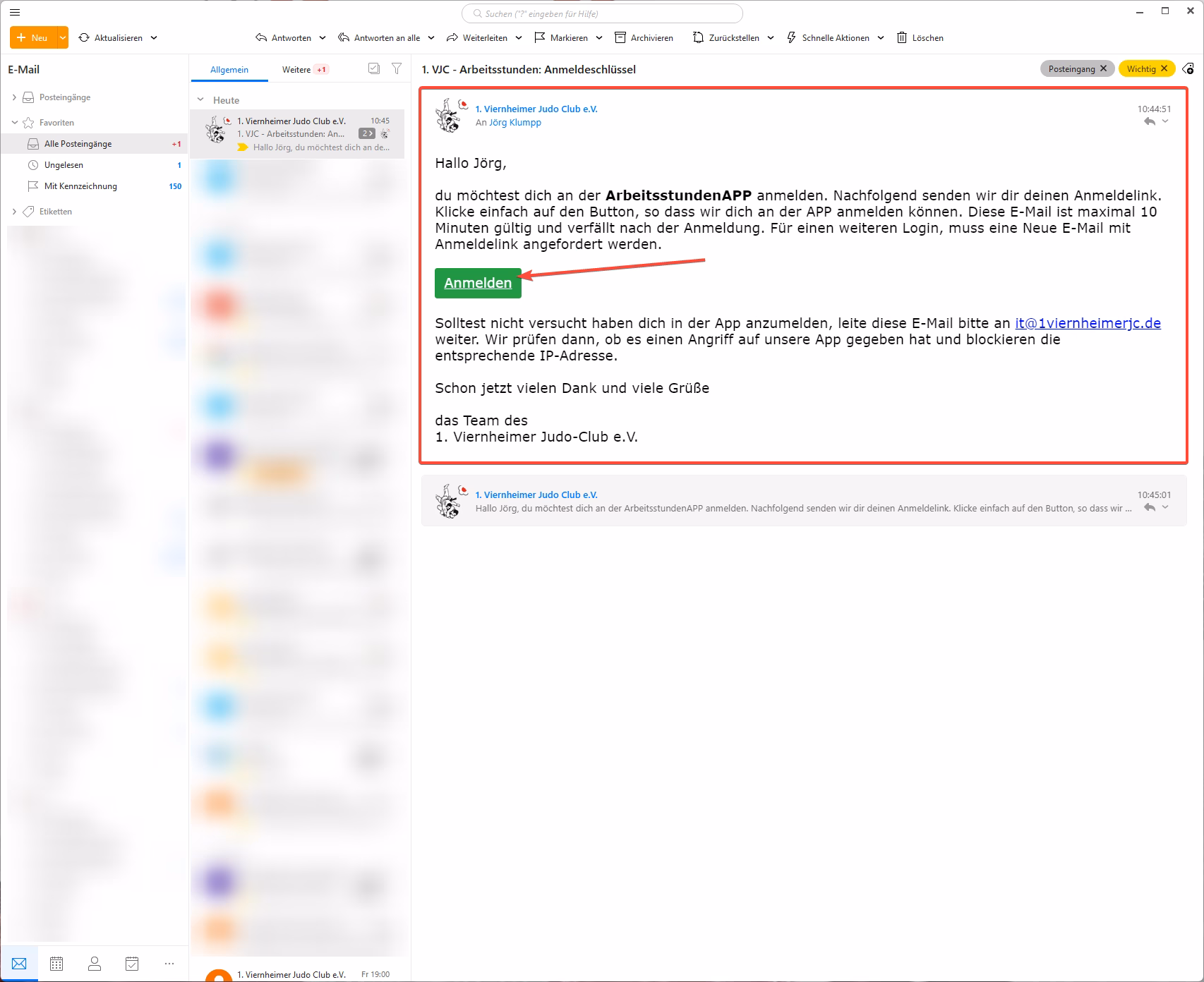 In der E-Mail ist ein grüner „Button“ mit dem man sich einfach an der Arbeitsstunden APP anmelden kann.